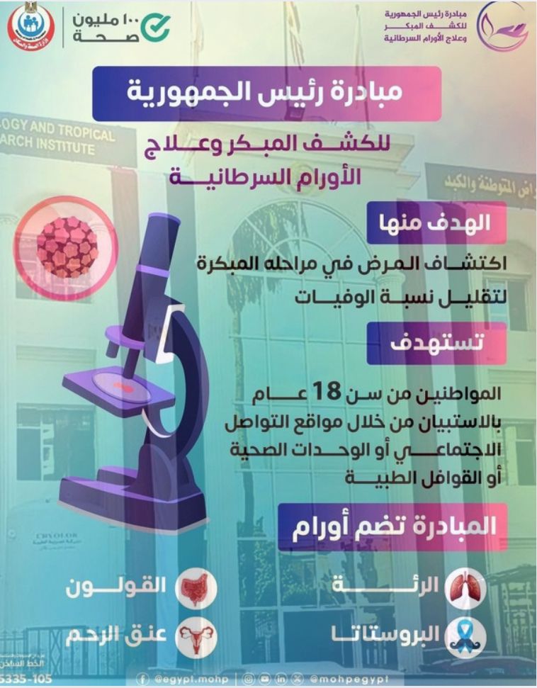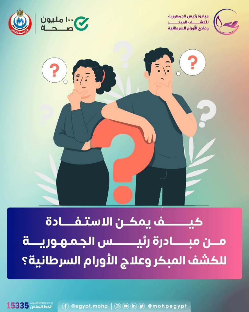 من خلال الرابط التالي: يمكنك التسجيل و الإجابة على استبيان مبادرة رئيس الجمهورية للكشف المبكر وعلاج الأورام السرطانية، أو متابعة نتائج الخدمات و التحاليل. وبناءا على نتائج الاستبيان سيتم تحديد درجة خطورة اصابتك بأحد الأورام السرطانيه (الرئه- القولون- البروستاتا أو عنق الرحم طبقا للنوع) بدون الحاجة للتوجه للوحدة الصحية و توجيهك في موعد محدد لتلقي الخدمة المناسبة لحالتك الصحية. اضغط هنا